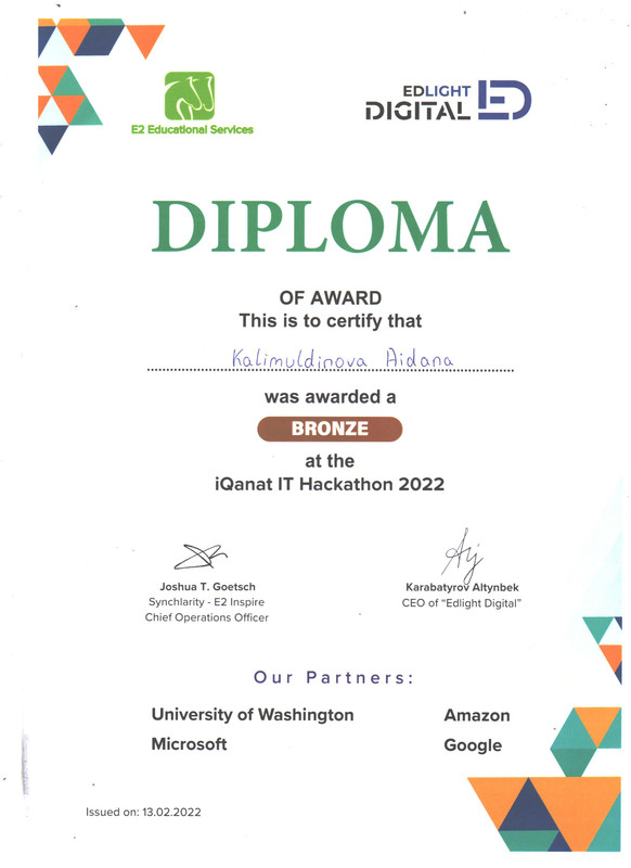 Кинорежиссер Аяған Шәжімбаев атындағы №3 Явленка орта мектебінің 9б сынып оқушысы Қалимулдинова Айдана Каиргельдиновна 2022 жылдың 12-13 ақпан аралығында IT -camp "Hucuton" олимпиадасына қатысып, үшінші жүлделі орынға ие болды